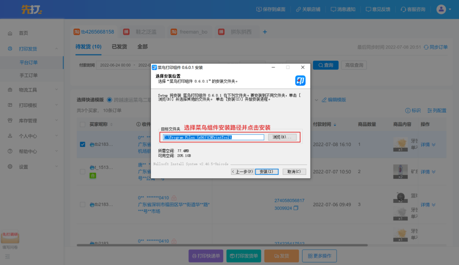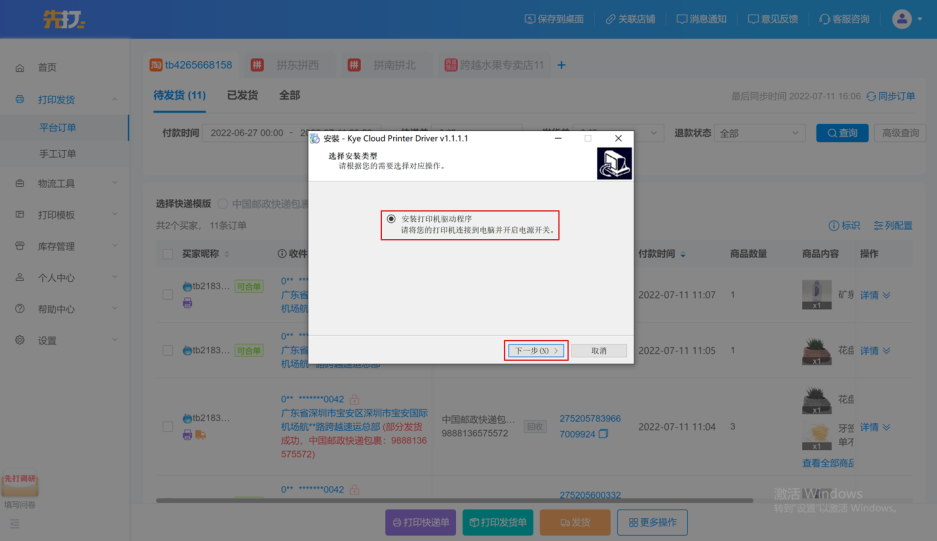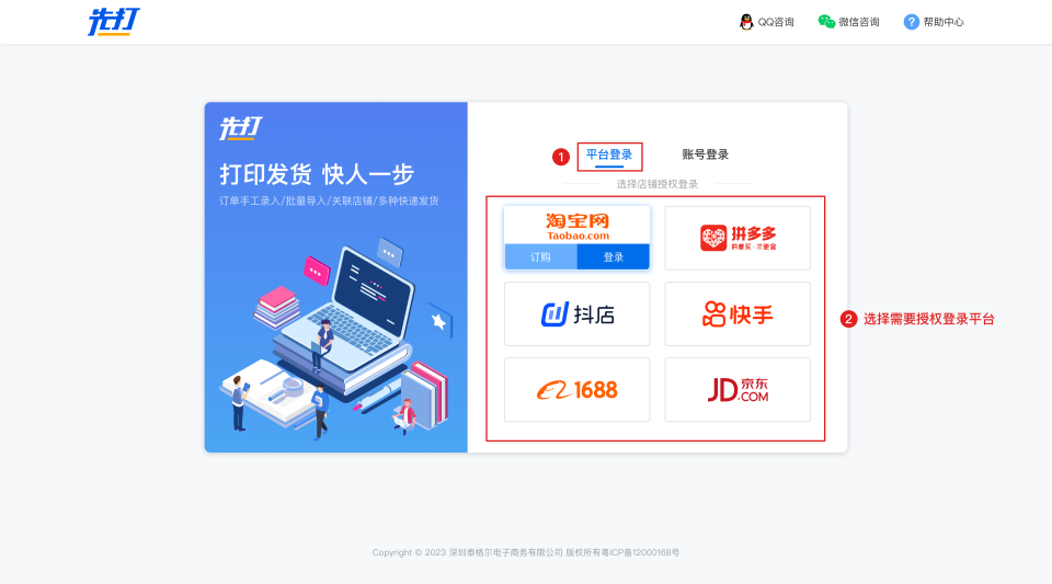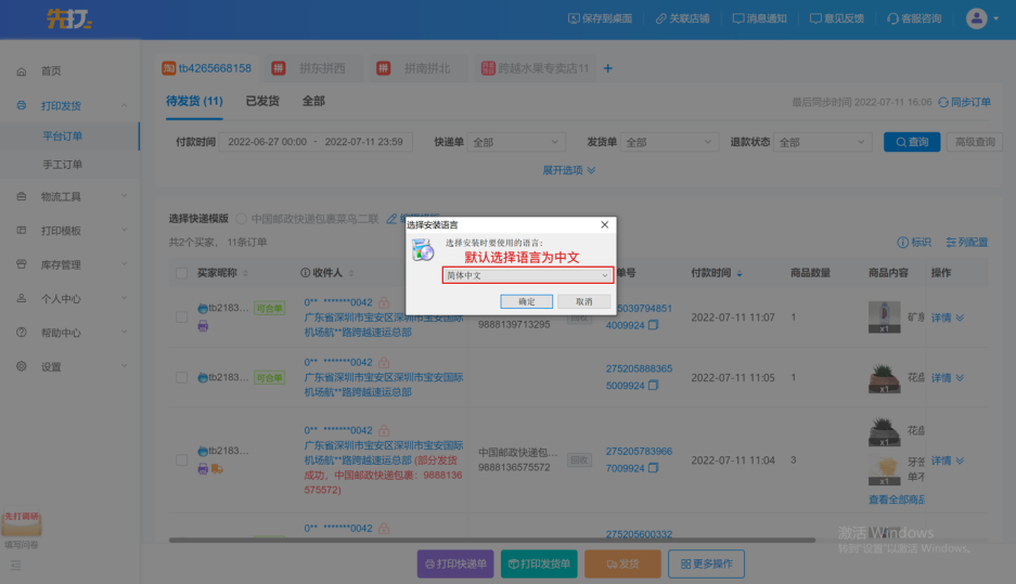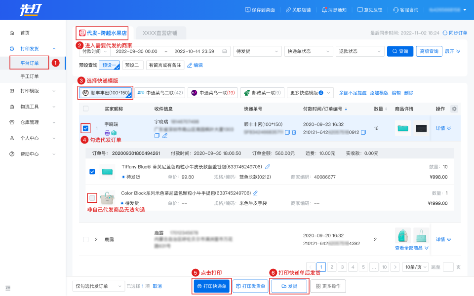 2️⃣ 点击打印发货 ➡️ 平台订单,进入需要代发的商家店铺 ➡️ 选择快递模版 ➡️ 勾选订单进行打印发货。