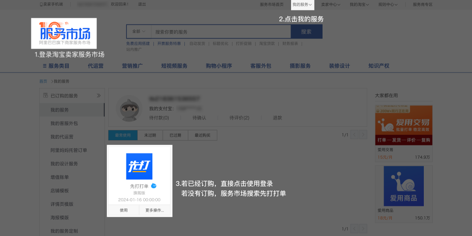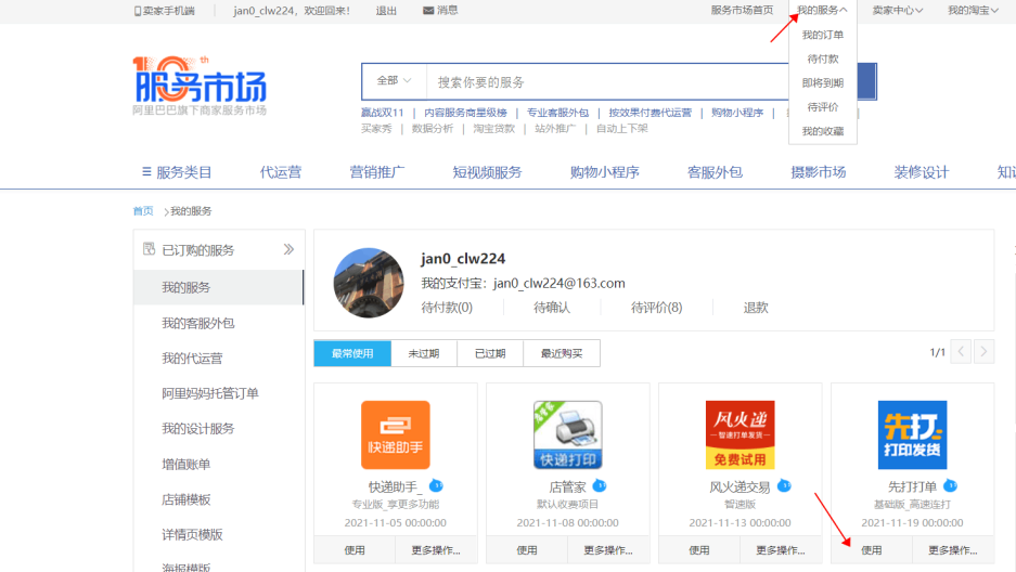 1️.在淘宝服务市场登录您的店铺:https://fuwu.taobao.com/index.htm