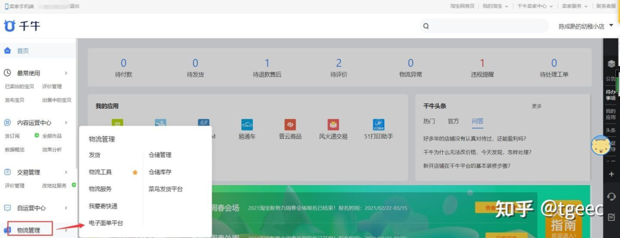 登录千牛后台 ➡️ 选择物流管理 ➡️ 电子面单平台。