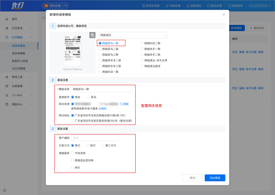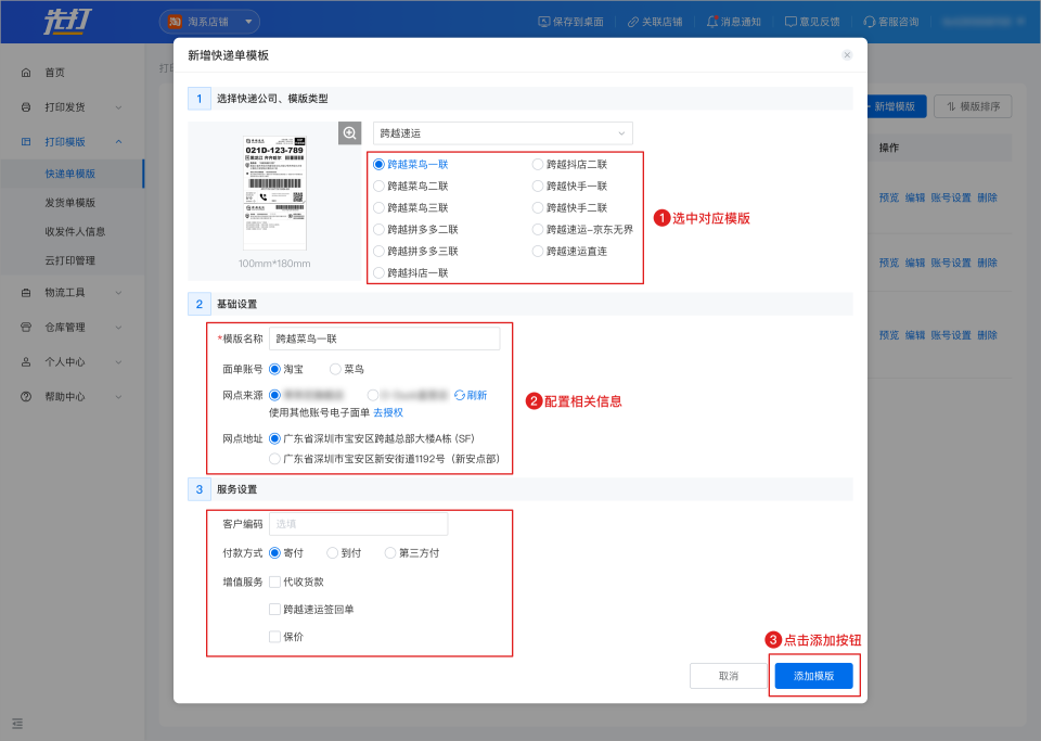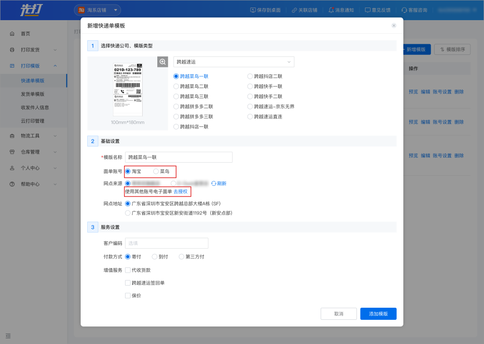 选择快递公司 ➡️ 选中需要添加的模版类型 ➡️ 设置电子面单来源、面单类型,网点、客户编码、业务类型等