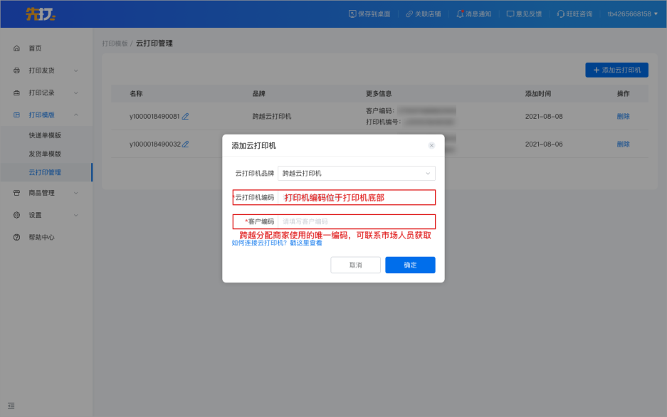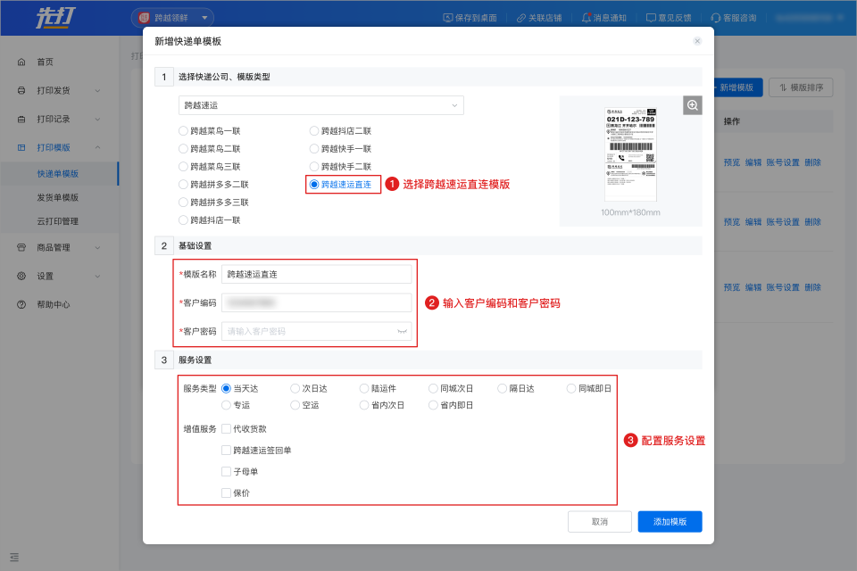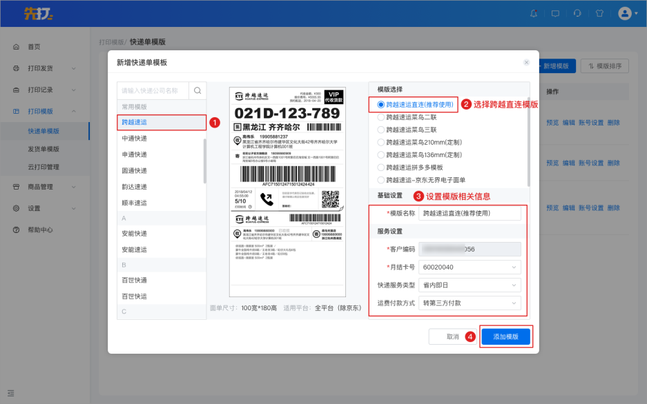 选择或搜索“跨越”快递公司,选择直连类型的面单,填写直连面单信息线下签合同的客户编码/月结卡号、所需的增值服务、选择快递付费方式及业务类型, 点击添加模版