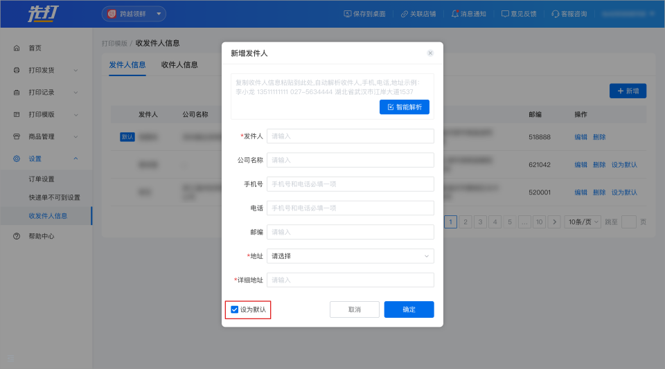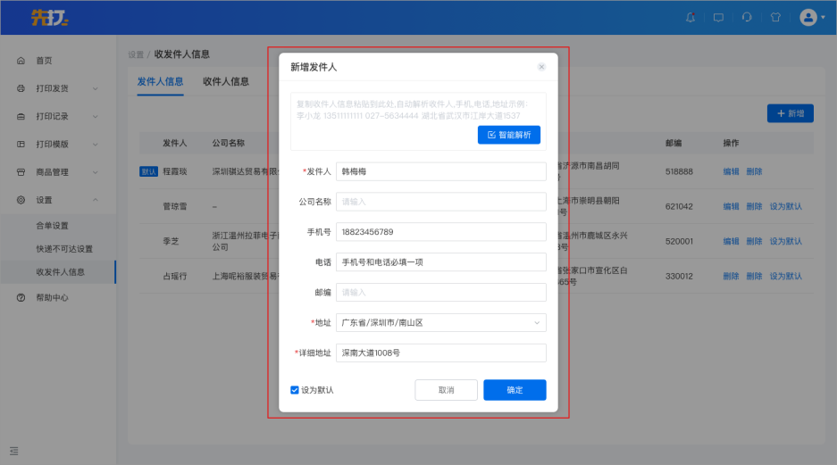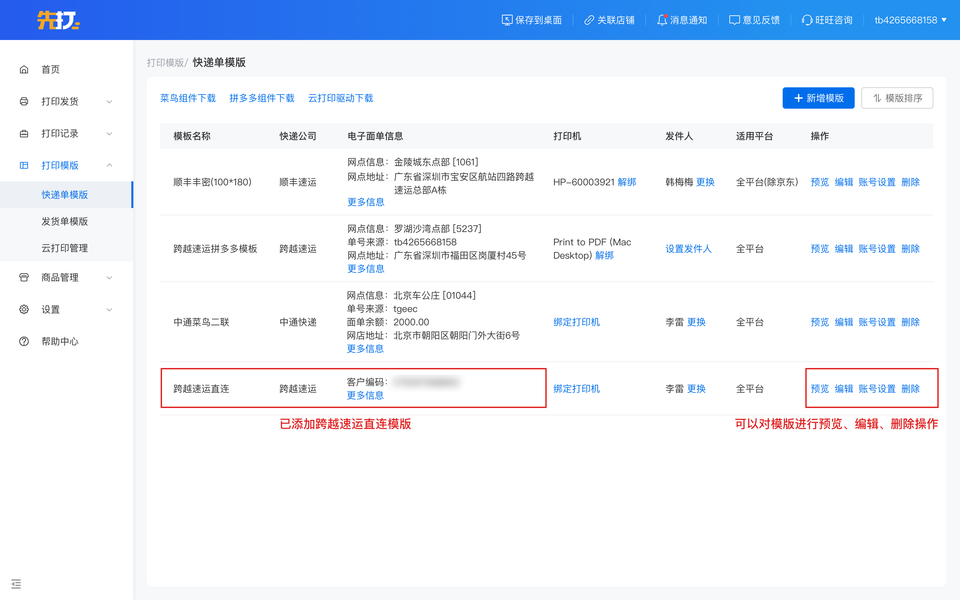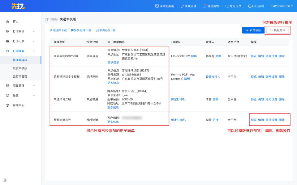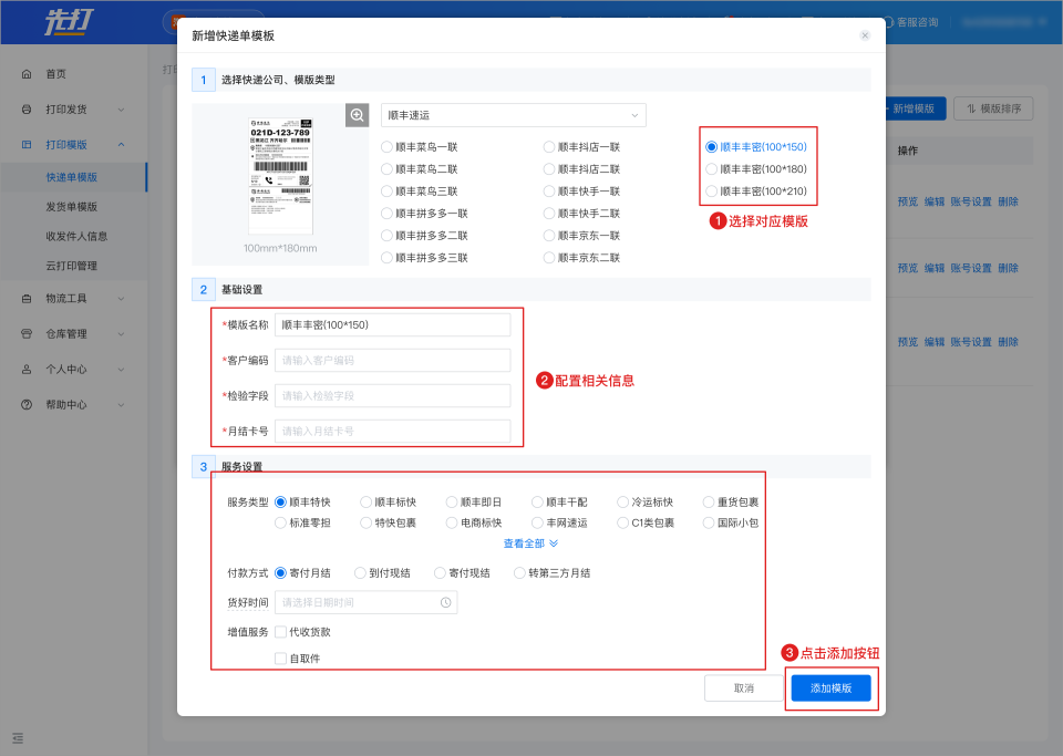进入【先打】系统,选择顺丰直联模板、面单类型、增值服务,并填写接入先打成功后生成的客户编码和校验字段的商家信息,顺丰直连快递模板成功添加后,即可打单发货。