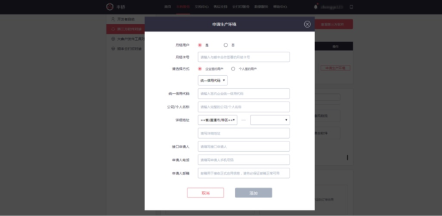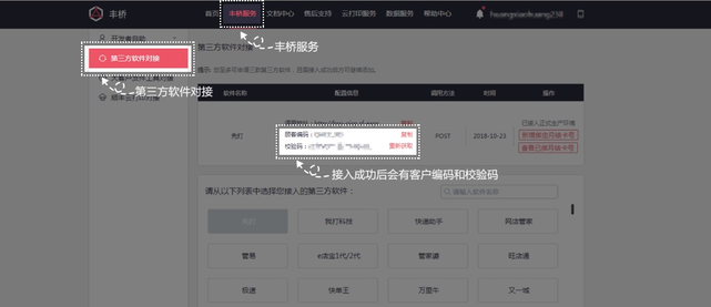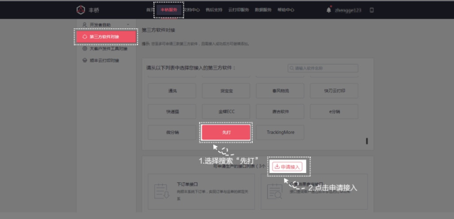 选择丰桥服务中的第三方软件对接,搜索/选择“先打”软件,再点击“申请接入”。