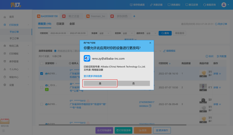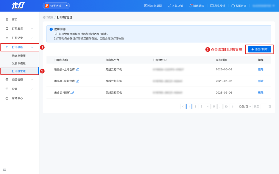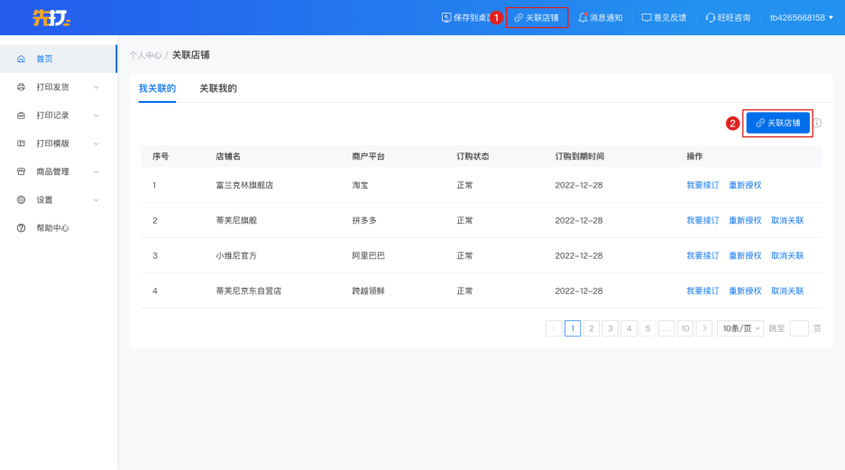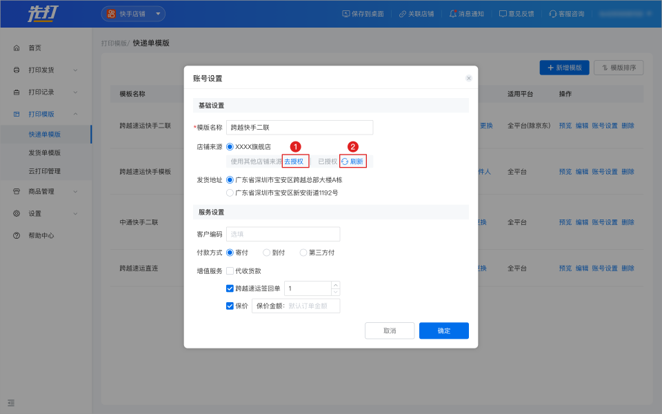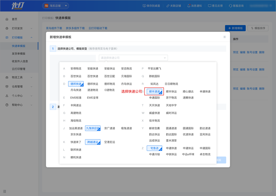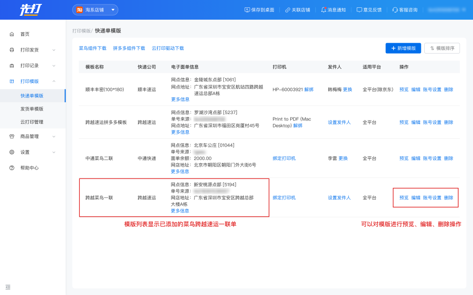 3️⃣ 关联店铺后,登录店铺A的账号,也可选择店铺A的快递模板打印发货店铺B的订单,实现电子面单共享。