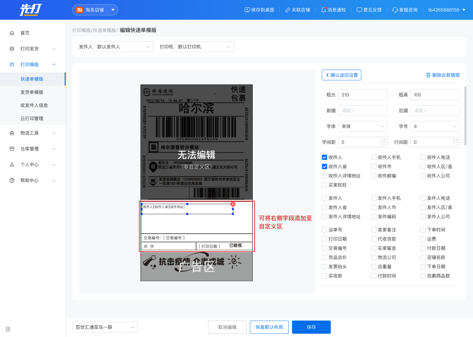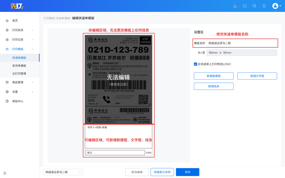 为了给商家提供更优质的体验,目前先打已成功对接跨越云打印机(其他云打印正对接中)。 本文就如何使用跨越云打印机编辑模板自定义区做详细说明。