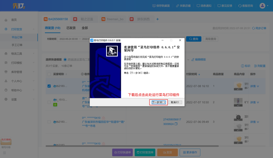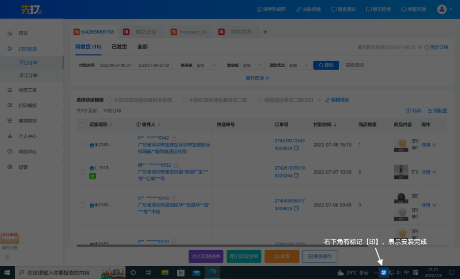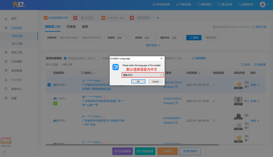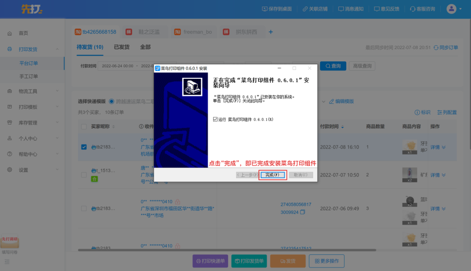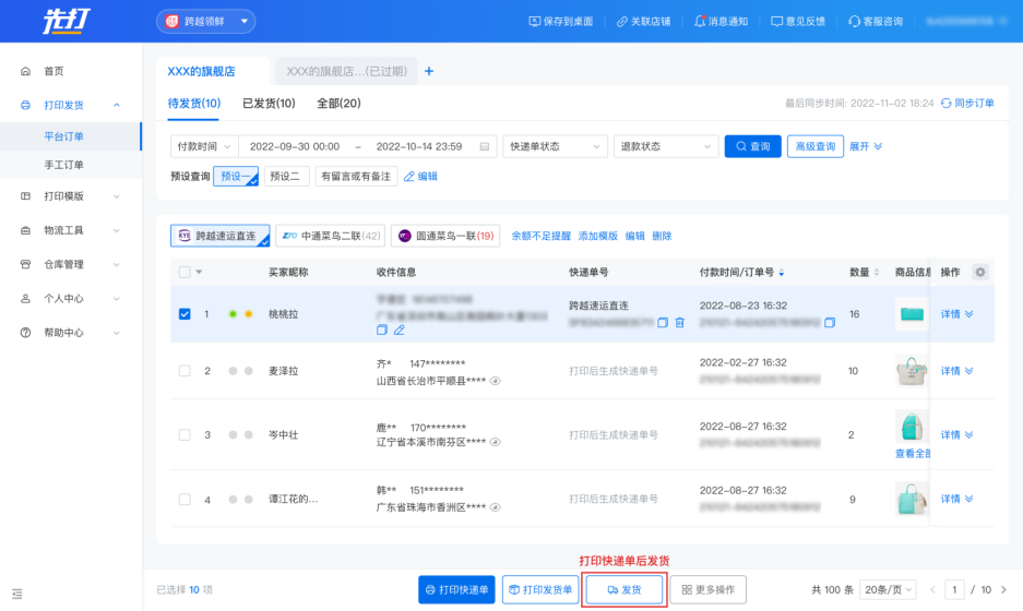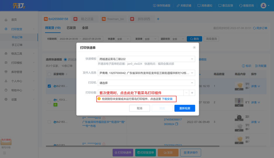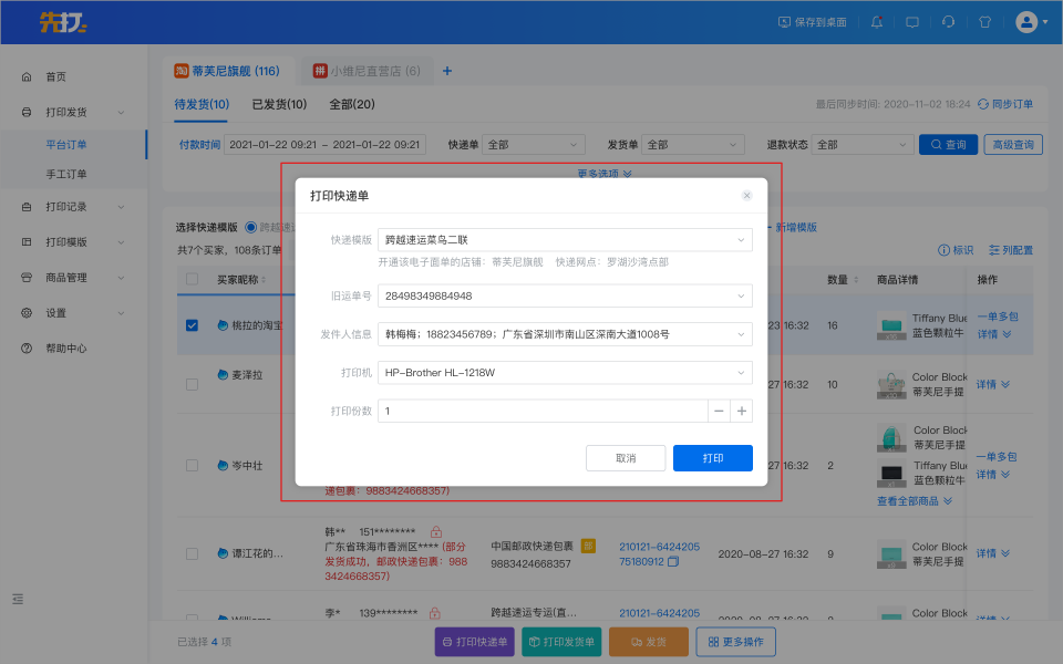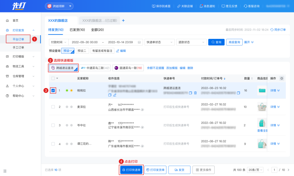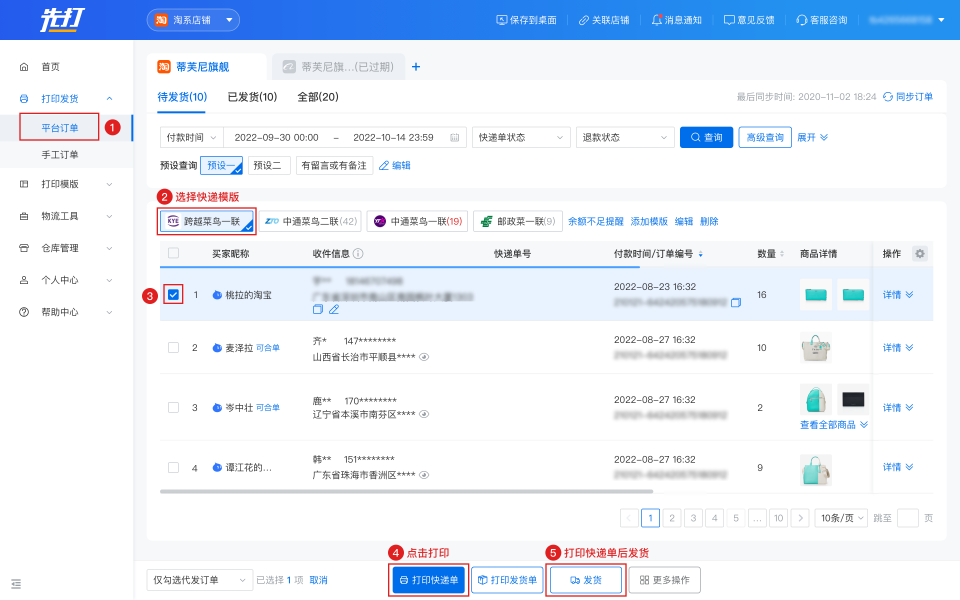5️⃣ 回到先打打单,点击【打印发货】【平台订单】页面,选择订单并选择快递单模板后,点击【打印快递单】按钮