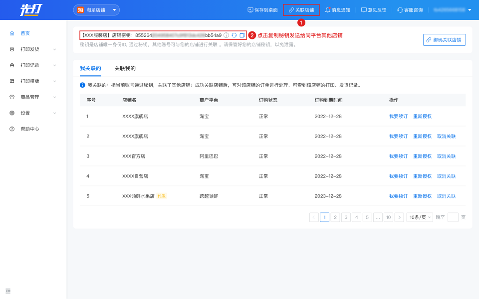 1️⃣ Step1:登录A店铺,点击【关联店铺】➡️ 复制店铺密钥,将秘钥粘贴分享给需要关联的B店铺即可