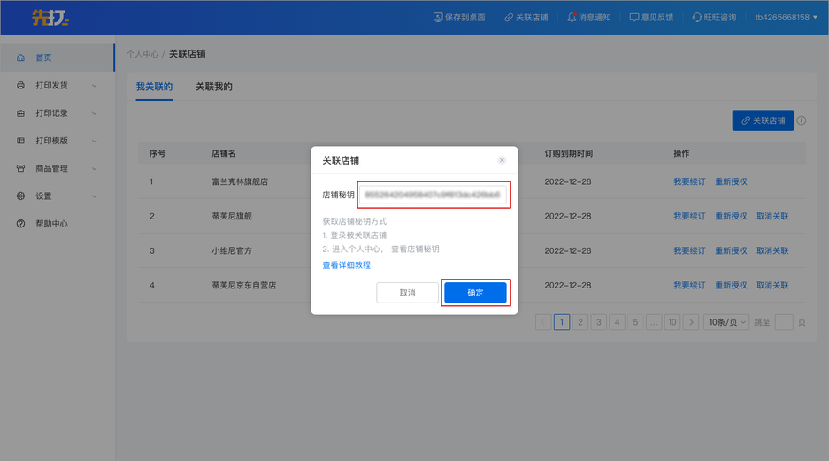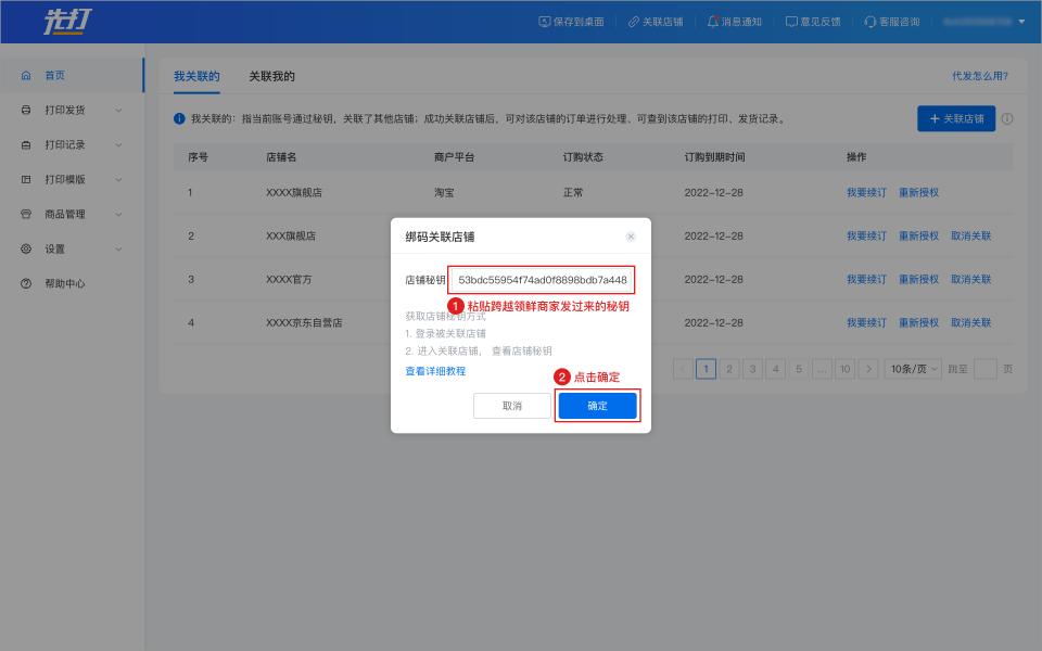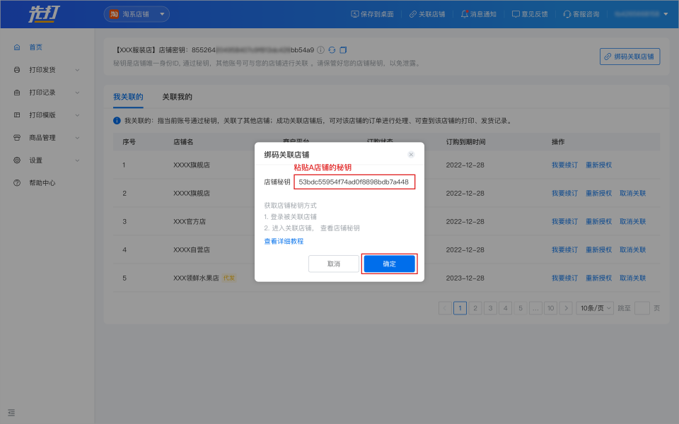 2️⃣ 使用店铺A授权登录先打,进入关联店铺,点击关联店铺,粘贴店铺B的秘钥后提交