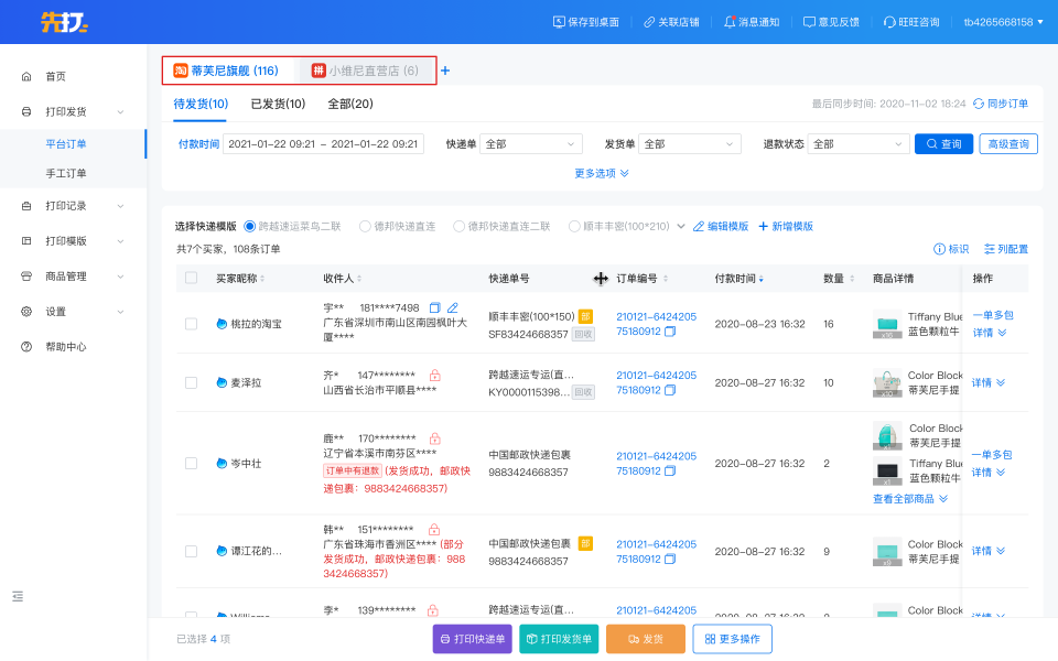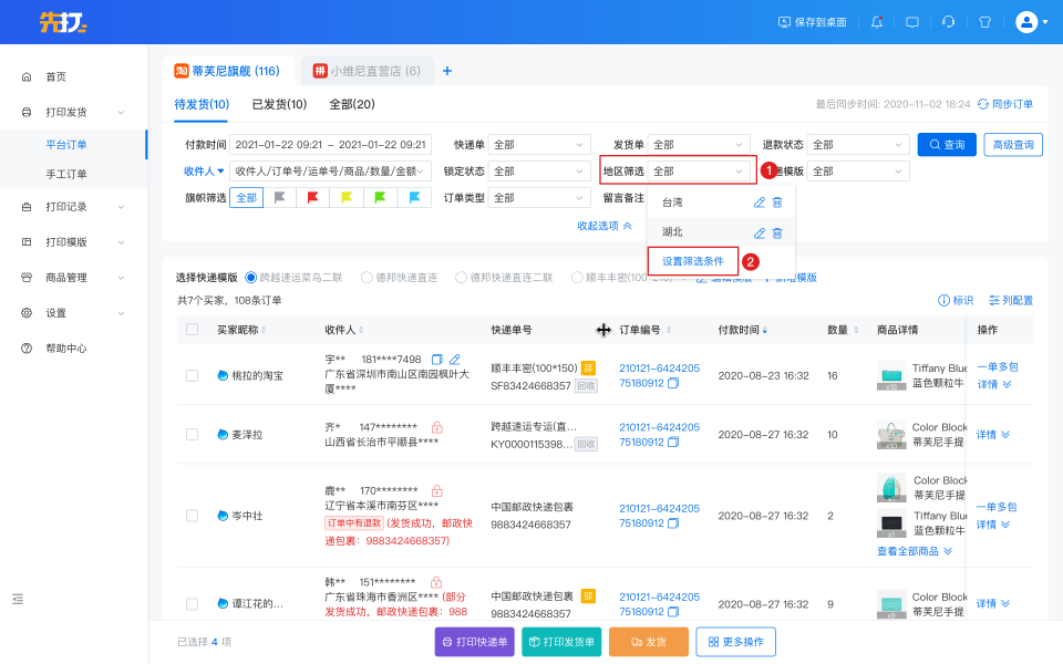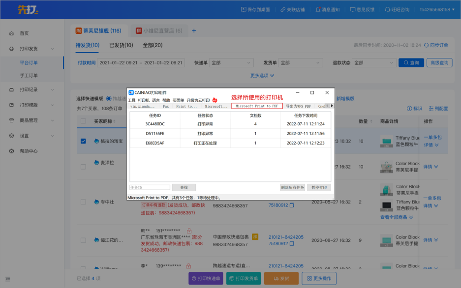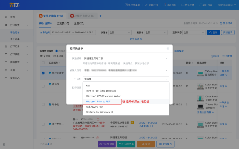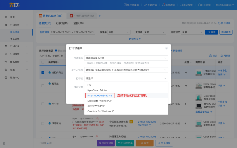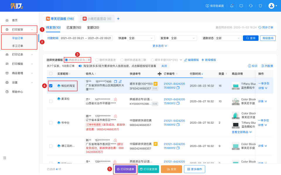 选择打印发货 ➡️ 平台订单 ➡️ 勾选需要打印的订单和快递单模板,点击打印快递单即可