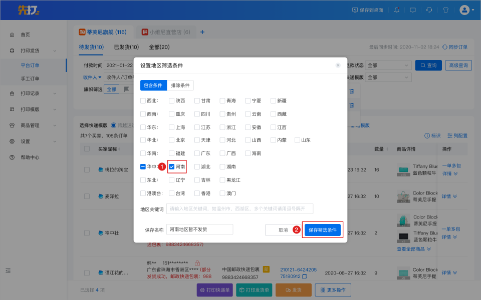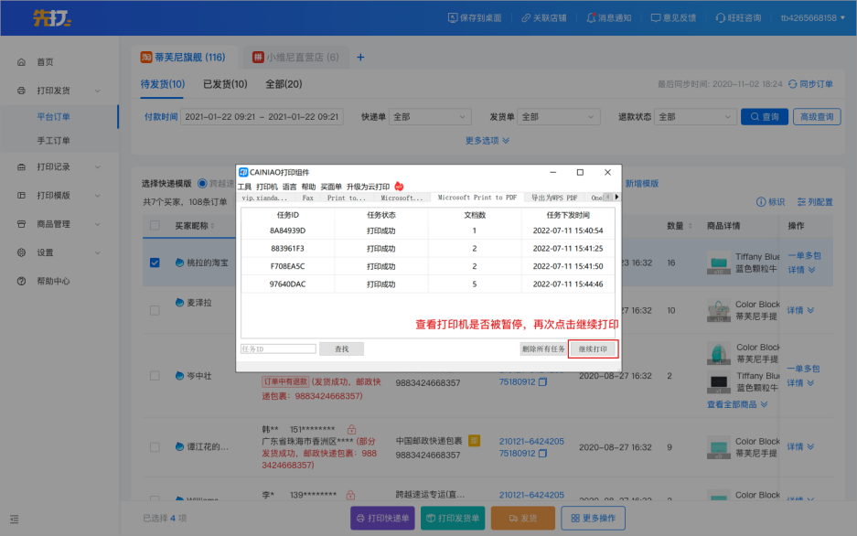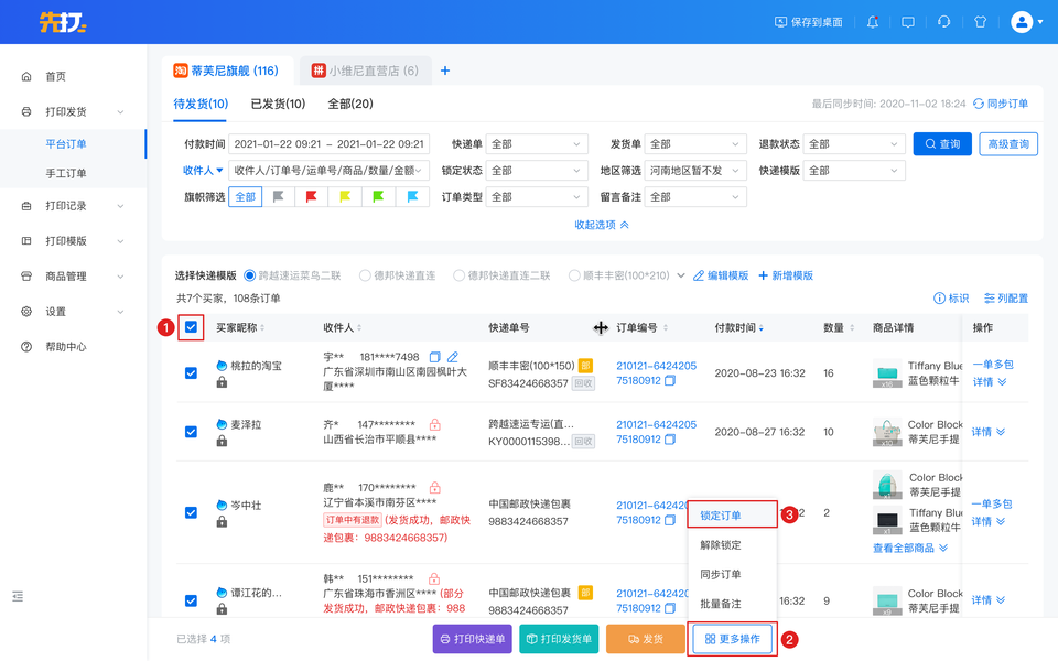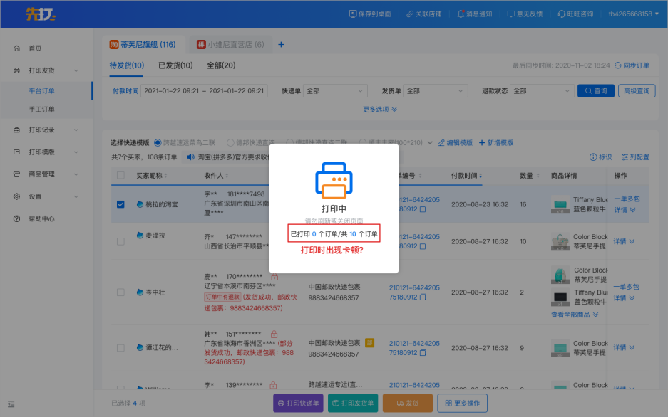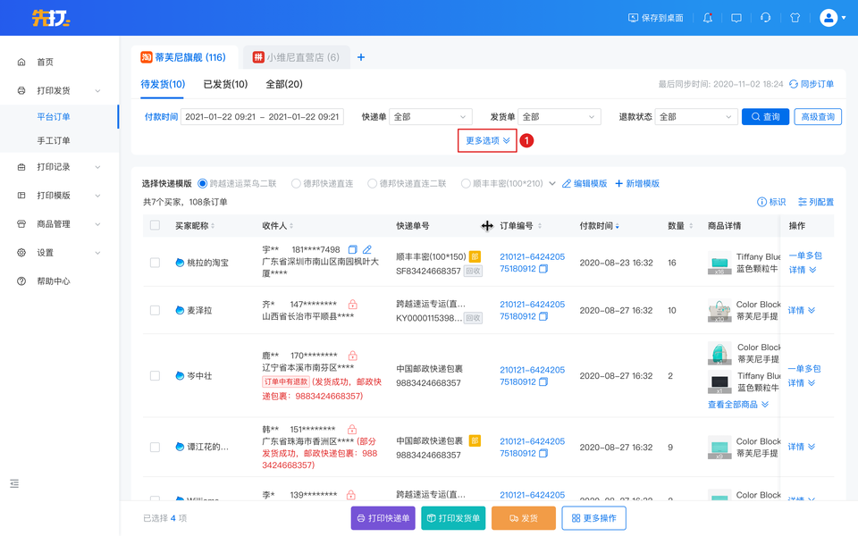 选择打印发货 ➡️ 平台订单 ➡️ 勾选需要打印的订单和快递单模板,点击打印快递单即可