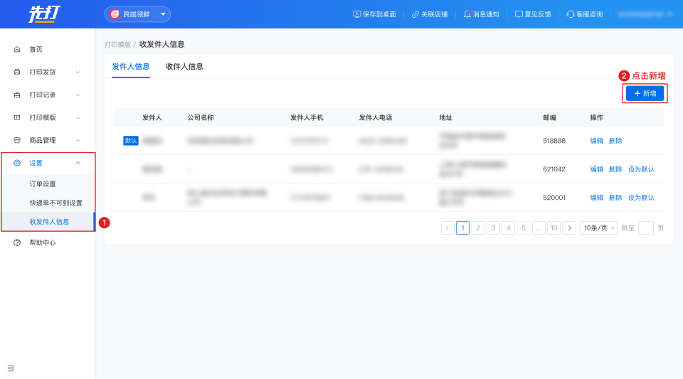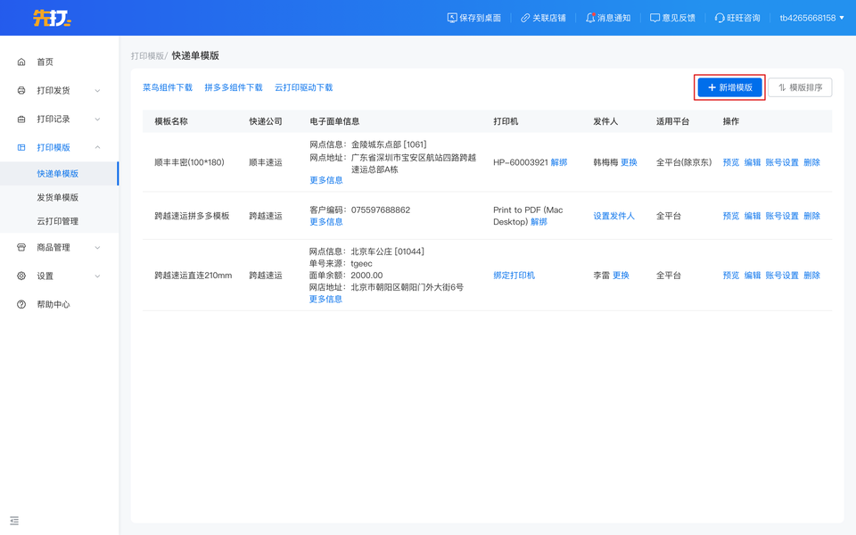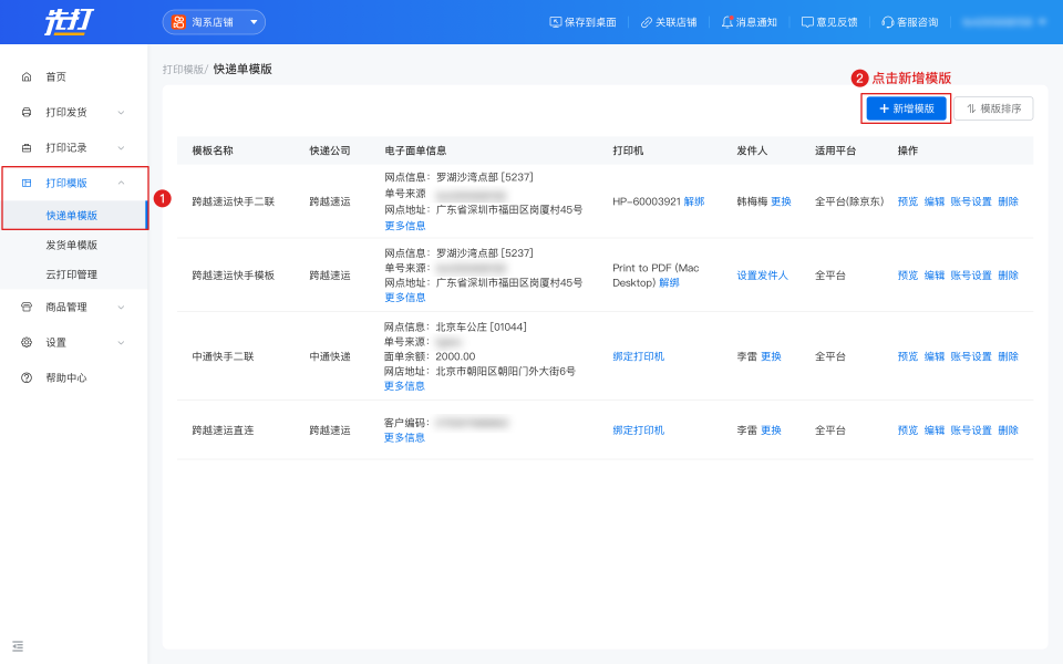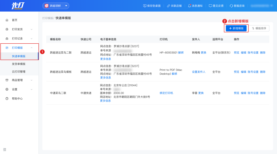 1️⃣ 进入先打后,选择【快递单模板】➡️ 点击【新增模板】