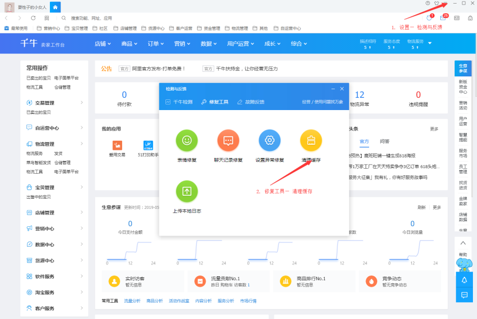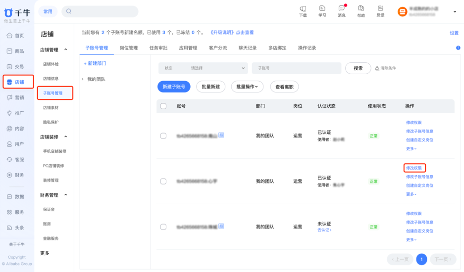 1️⃣ Step 1:用主账号登录千牛,点击 店铺管理 ➡️ 子账号管理 ➡️ 修改权限