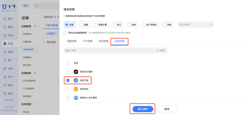 2️⃣ Step 2:进入修改权限,选择应用权限模块,勾选需要授权的应用 ➡️ 确认修改,即完成子账号的授权