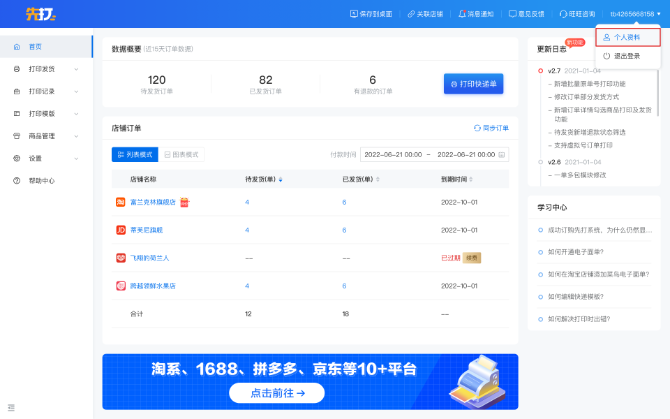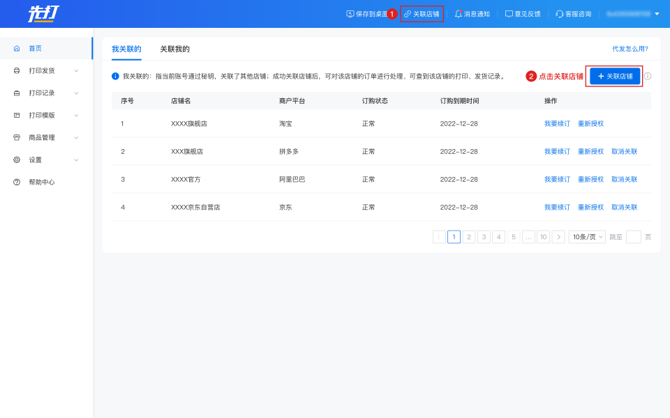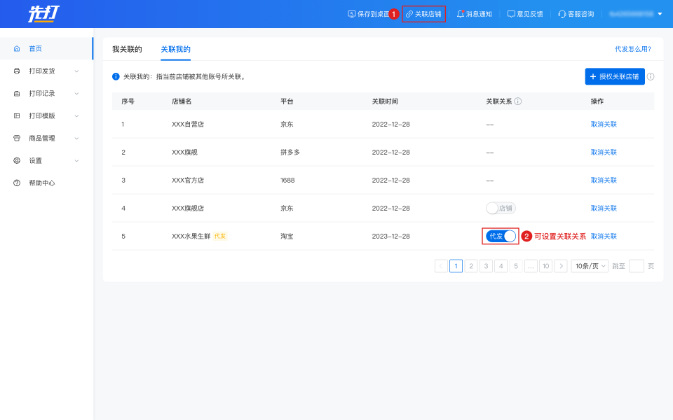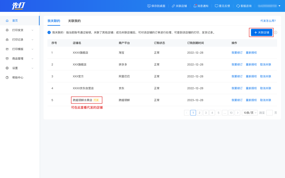 ⭕ 目的:用于共享电子面单,便于一个主账号统一管理多平台多店铺
