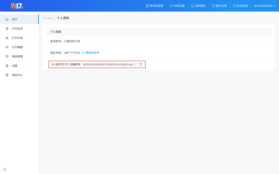 1️⃣ 使用店铺B授权登陆先打,点击右上角登录账号,进入个人中心 ➡️ 个人资料,复制店铺B的店铺秘钥