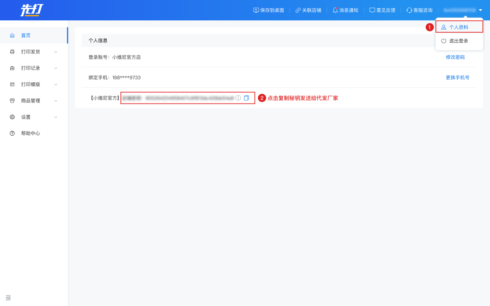 1️⃣ 点击个人资料,复制秘钥并发送给代发厂家,等待厂家关联店铺。
