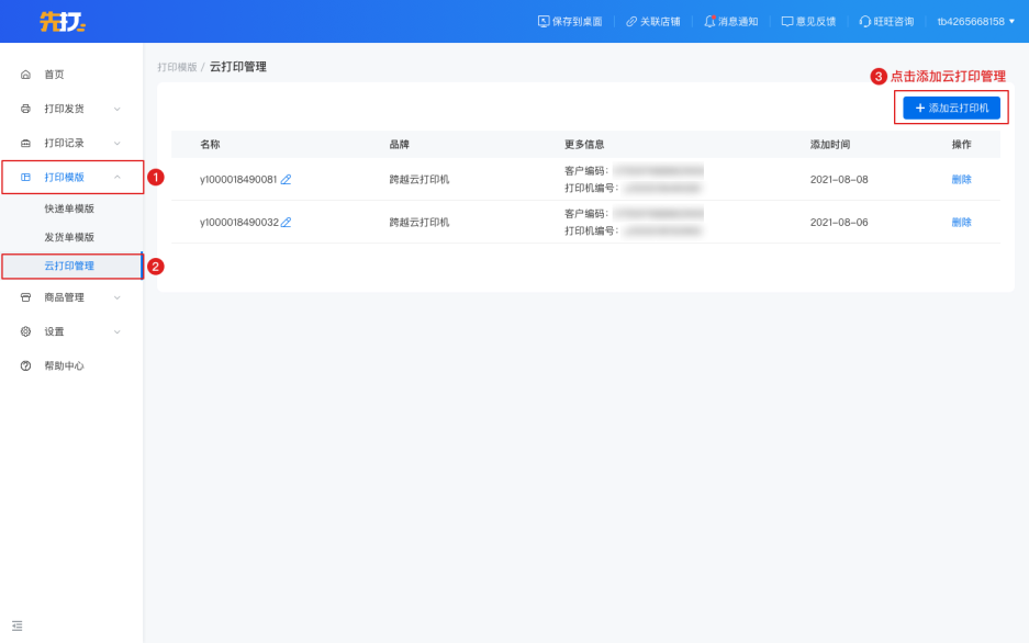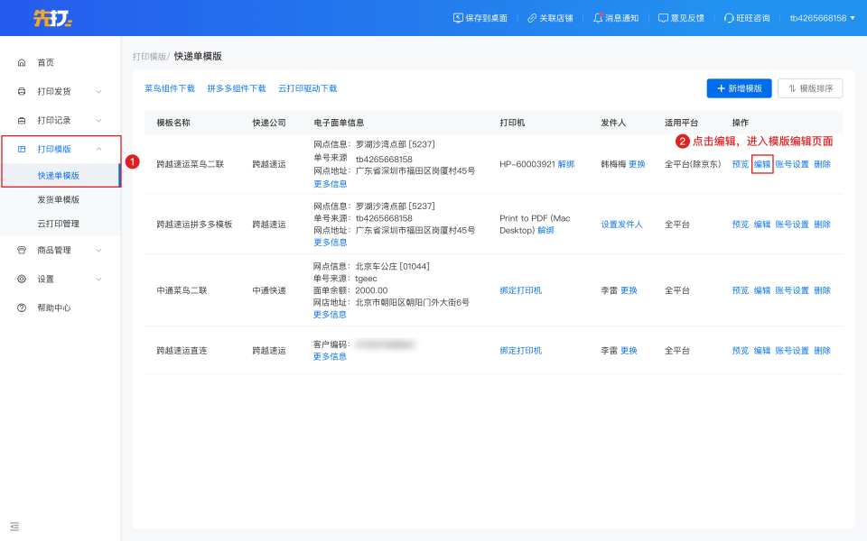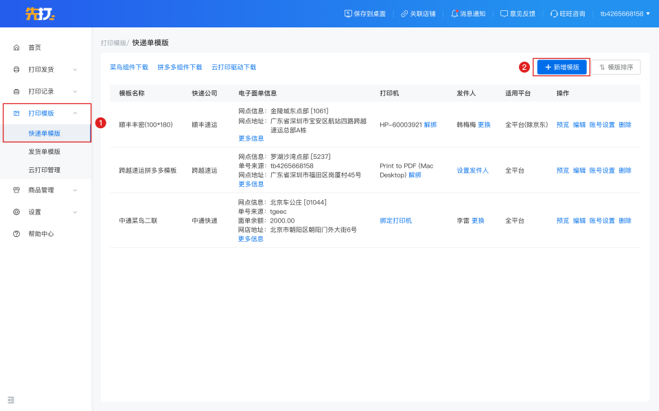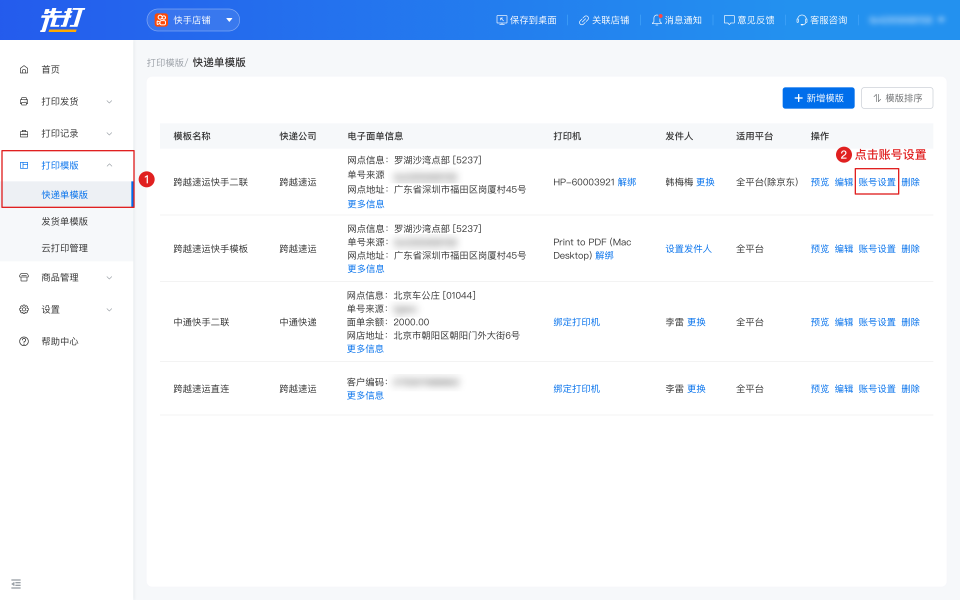 1️⃣ 点击【打印模版】➡️【快递单模版】➡️ 在模版列表中找到对应的快递单模版,点击【账号设置】