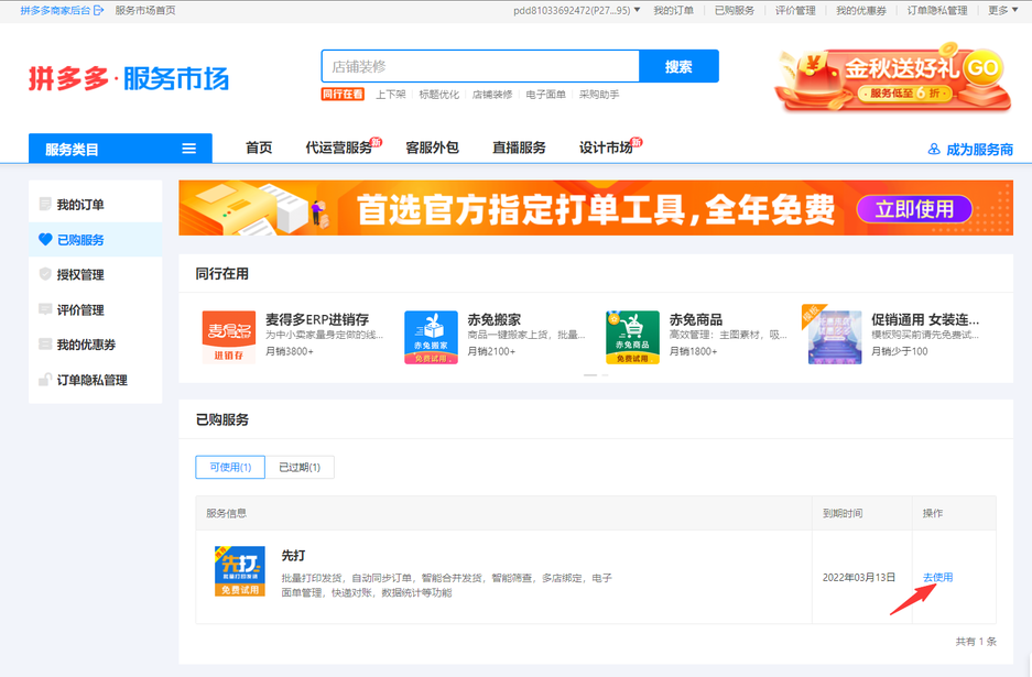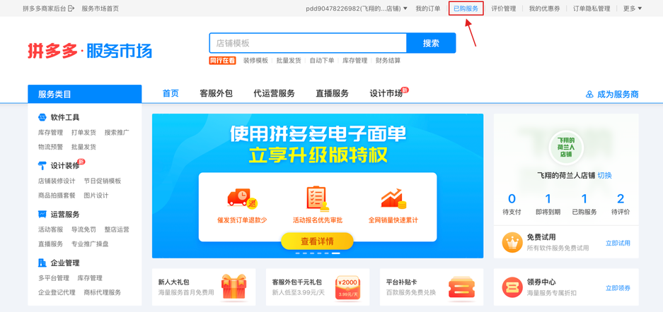 1️.在拼多多服务市场登录您的店铺:https://fuwu.pinduoduo.com/service-market/service-detail?detailId=195