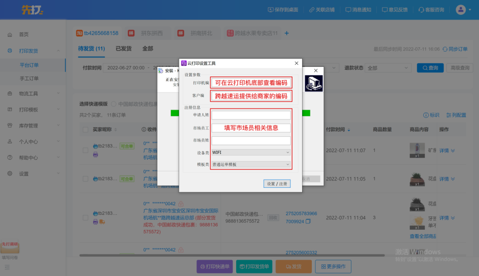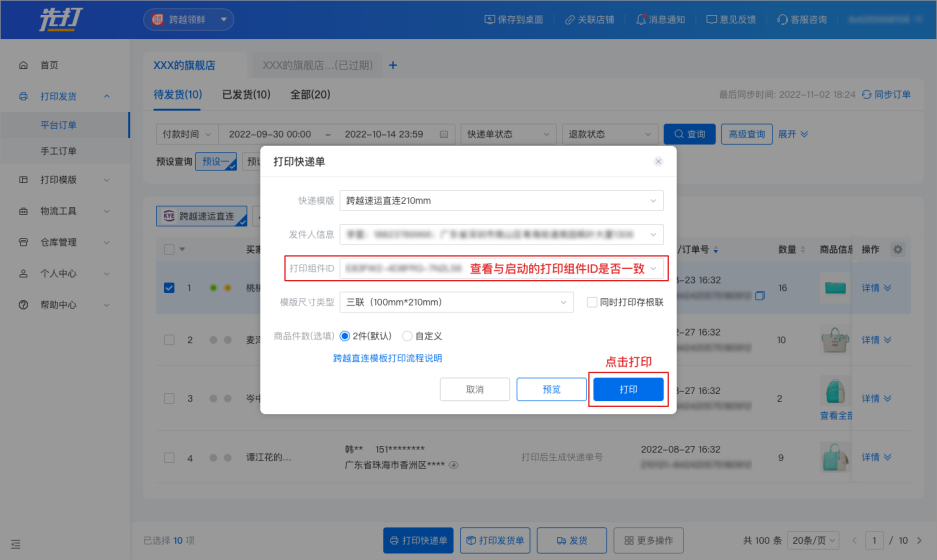 6️⃣ 在打印弹窗中,选择跨越打印组件,选择模板尺寸类型和发件人信息,打印成功后点击发货
