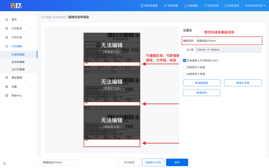 选择【打印模板】- 【快递单模板】,在快递单模板页面点击“编辑”