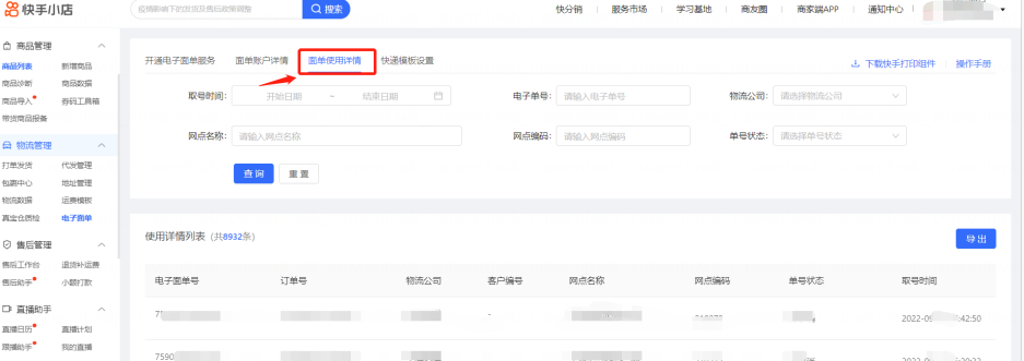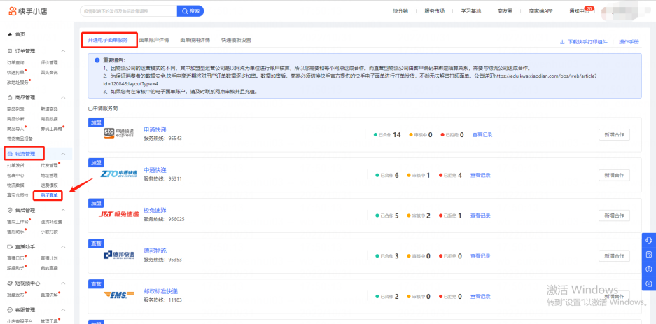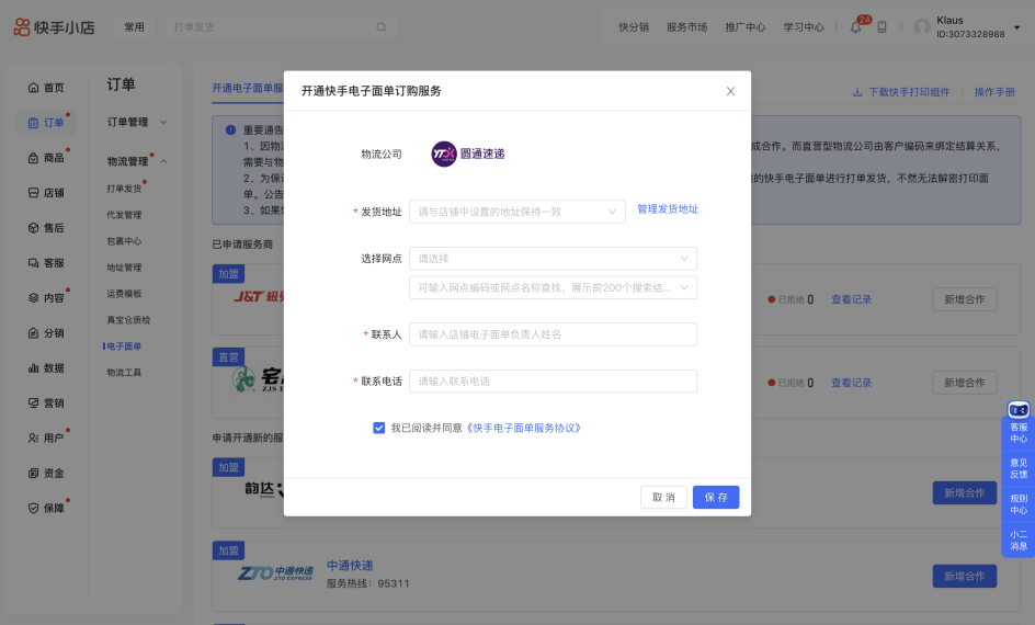 登录快手小店后台 ➡️ 物流管理 ➡️ 电子面单 ➡️ 开通电子面单服务