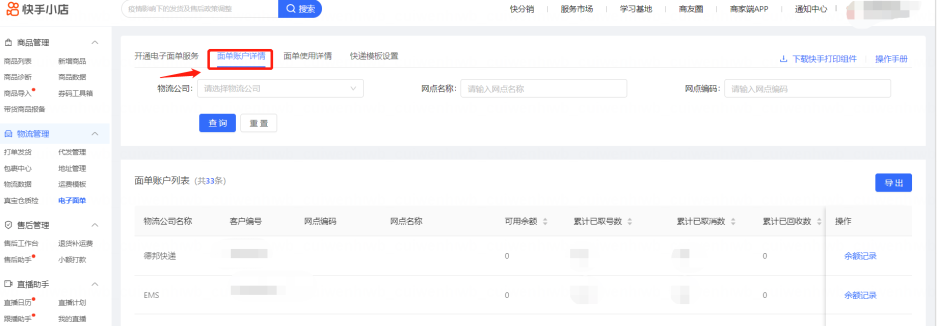 点击【面单账户详情】可查看合作网点面单使用量及剩余额度