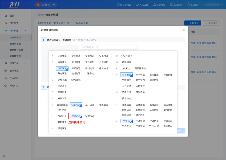 2️⃣ 点击跨越速运物流,选中跨越直连模板(不要选跨越菜鸟、跨越拼多多模板)