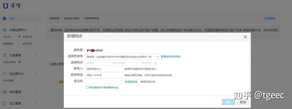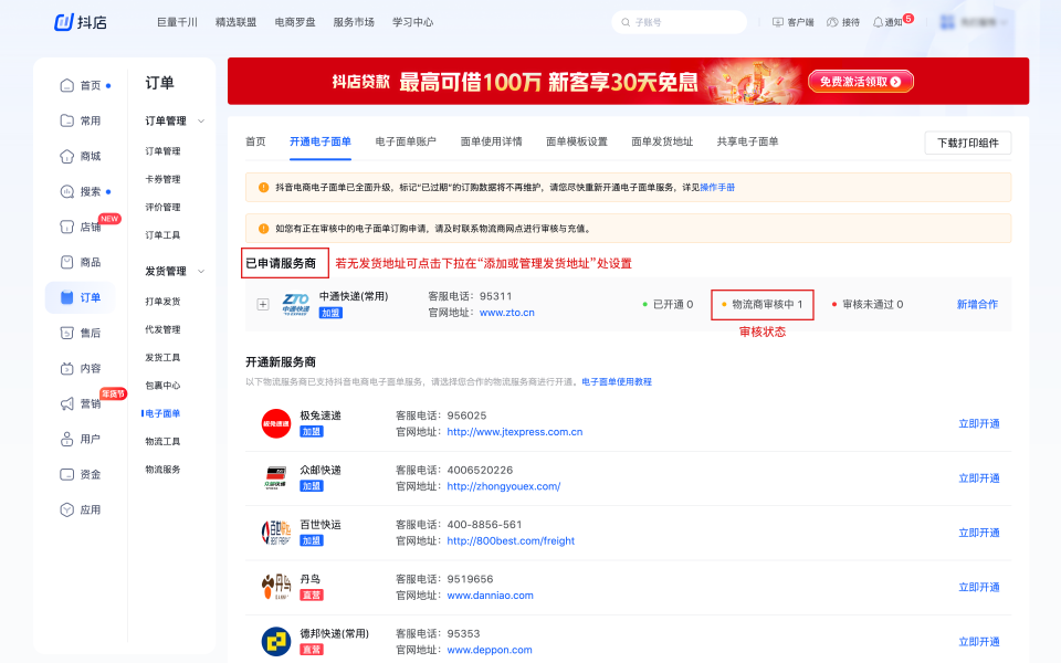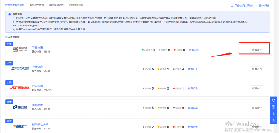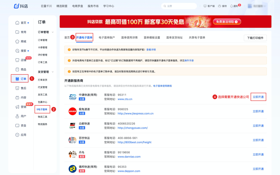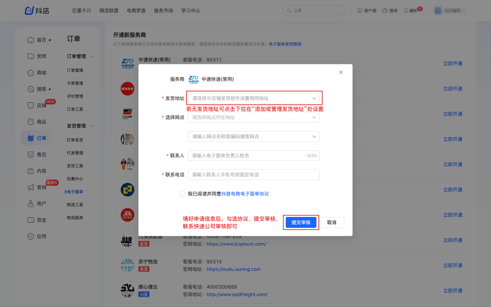 点击订单 ➡️ 电子面单 ➡️ 开通电子面单服务 ➡️ 选择快递公司 ➡️ 新增网点 ➡️ 填写相关信息