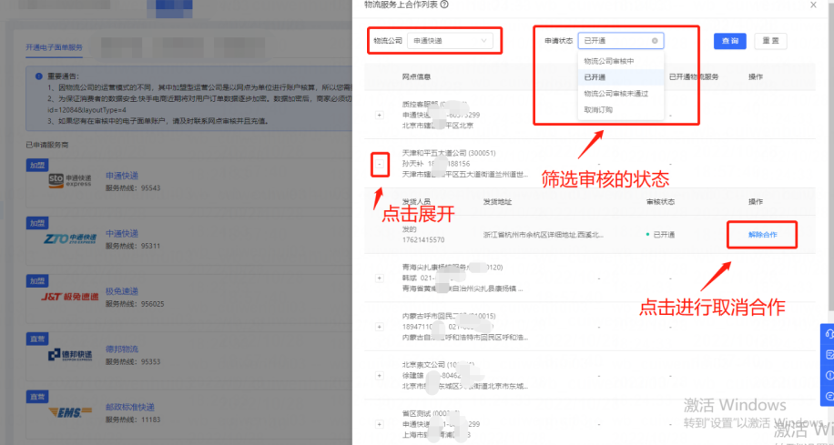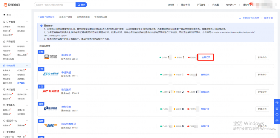 点击【查看记录】查看网点信息及审核状态,未成功开通的需要联系物流公司负责人员进行审核确认
