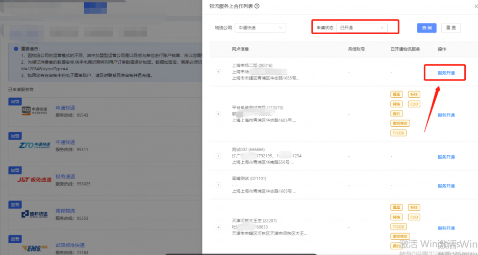 1️⃣ 筛选状态为已开通的网点,点击【服务开通】