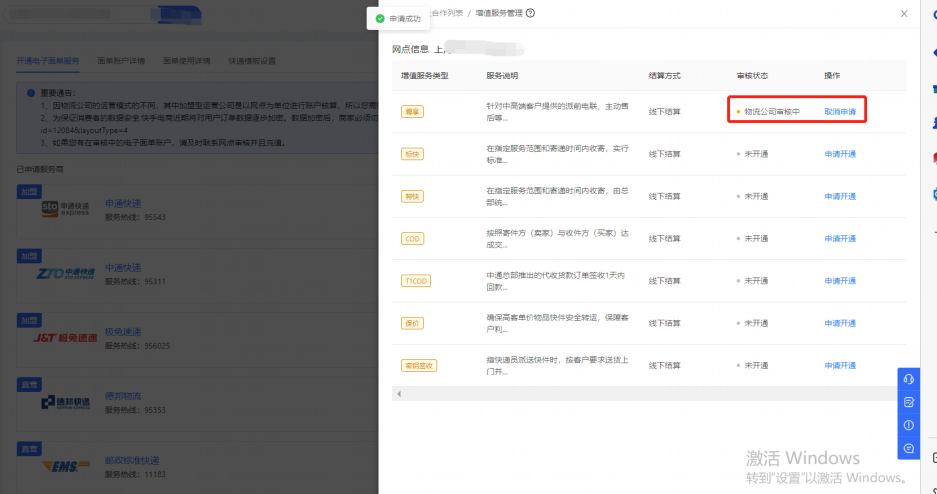 提交申请后,可在「已申请服务商」查看进度,状态显示【审核中】表示需联系快递网点审核,【已开通】表示可让快递充值单号后使用