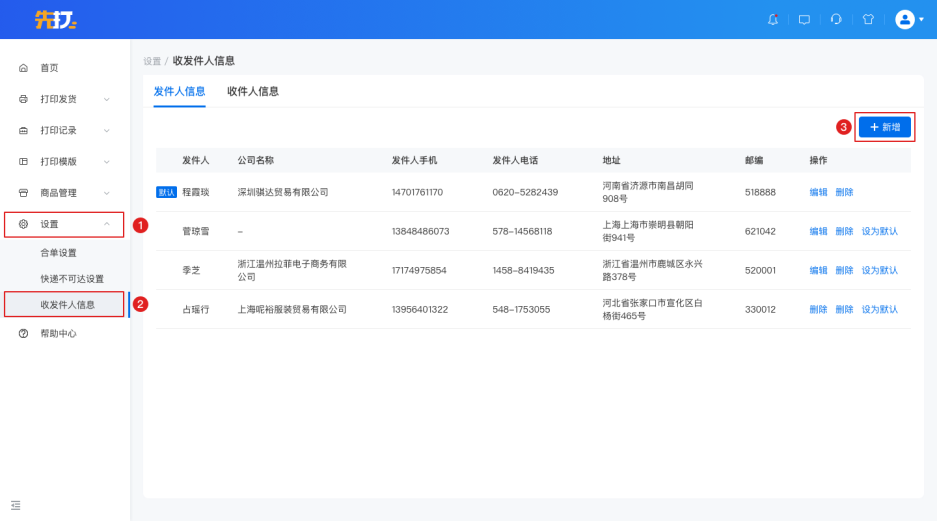 3️⃣ 点击【设置】➡️【收发件人信息】➡️ 点击【新增发件人】