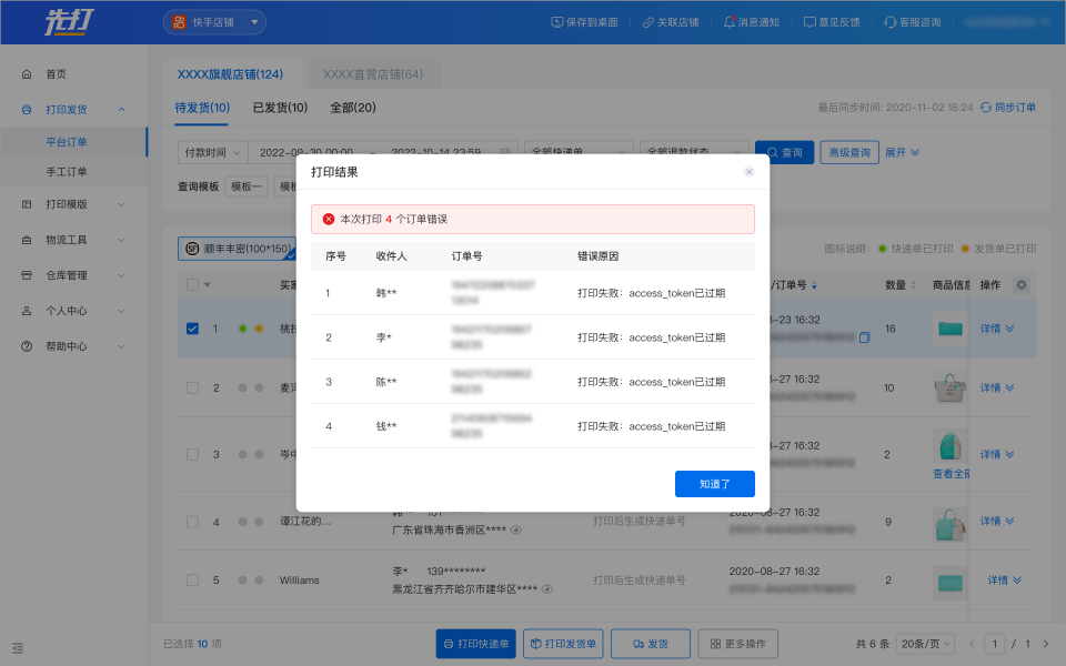 如果您在打印快递单后,打印结果显示“打印失败:access_token过期”,可能是因为您的快递单模版授权信息已过期所导致的。