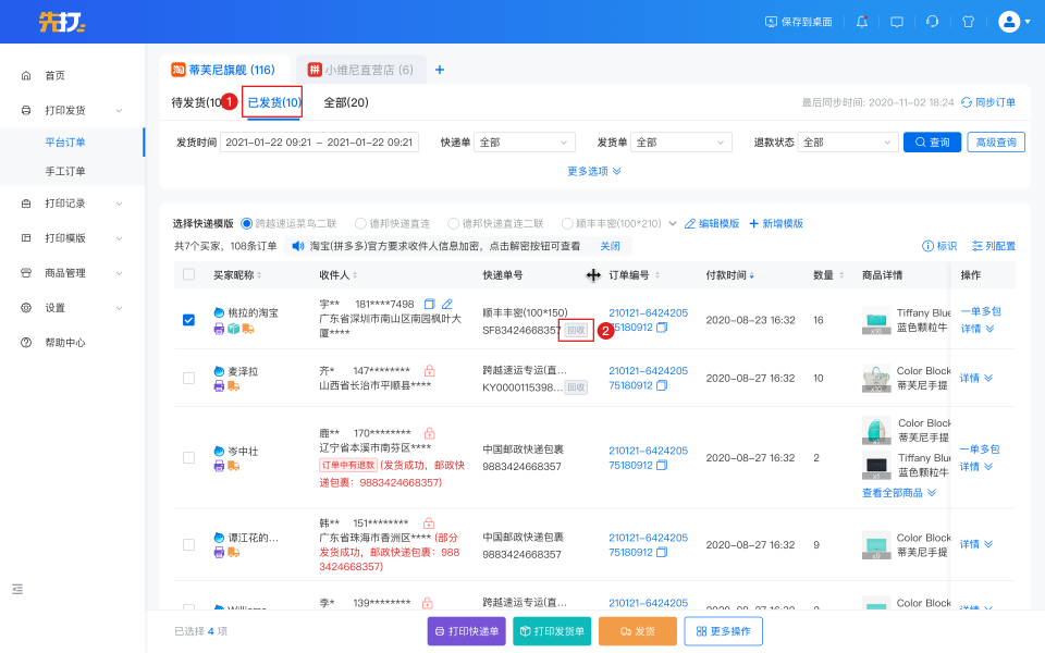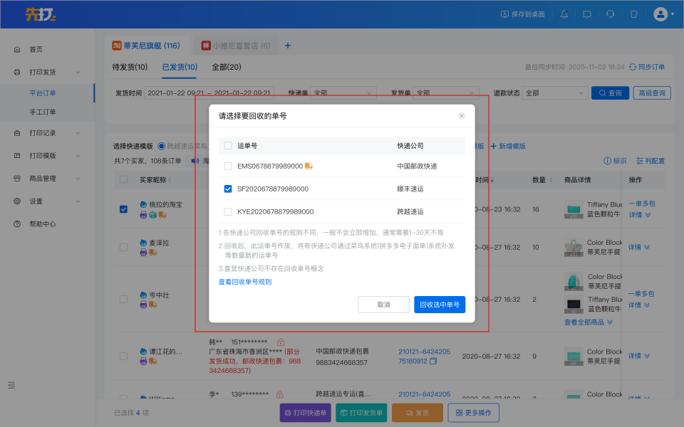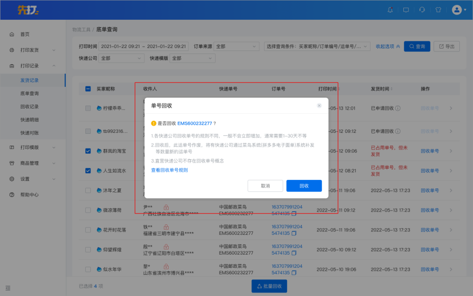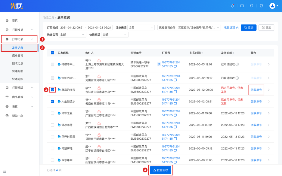 3. 可以使用单号回收再用功能,避免单号浪费,节约快递单成本。