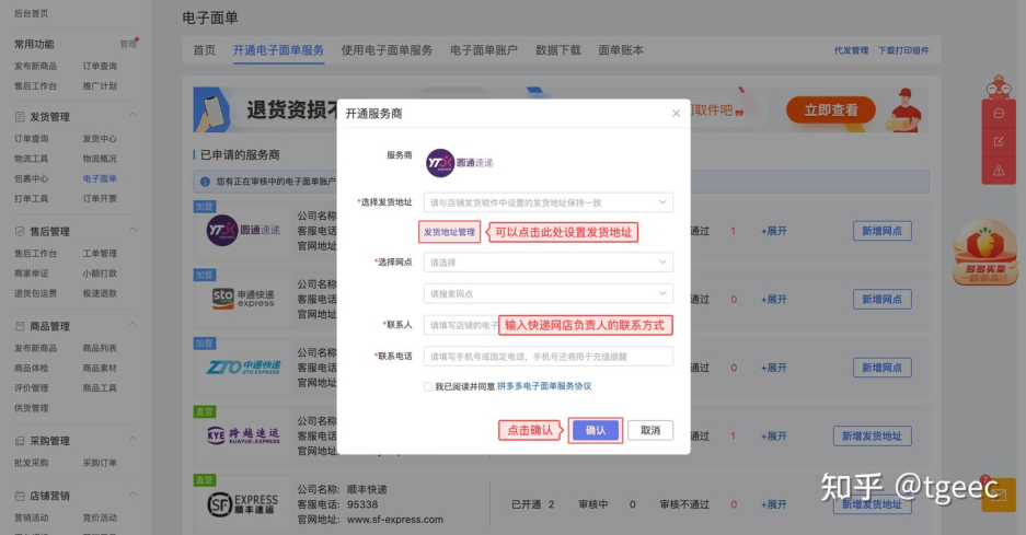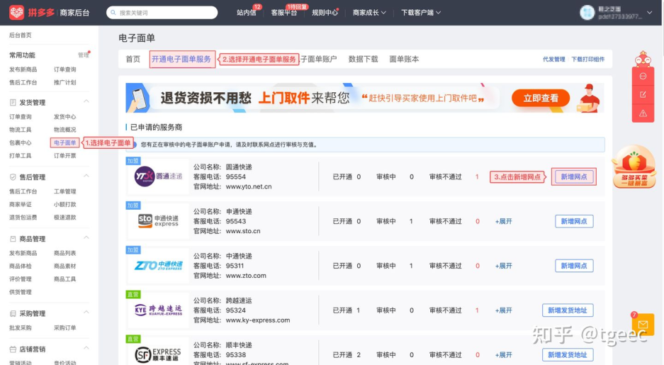 拼多多商家后台 ➡️ 电子面单 ➡️ 开通电子面单服务 ➡️ 选择快递公司 ➡️ 新增网点 ➡️ 填写相关信息